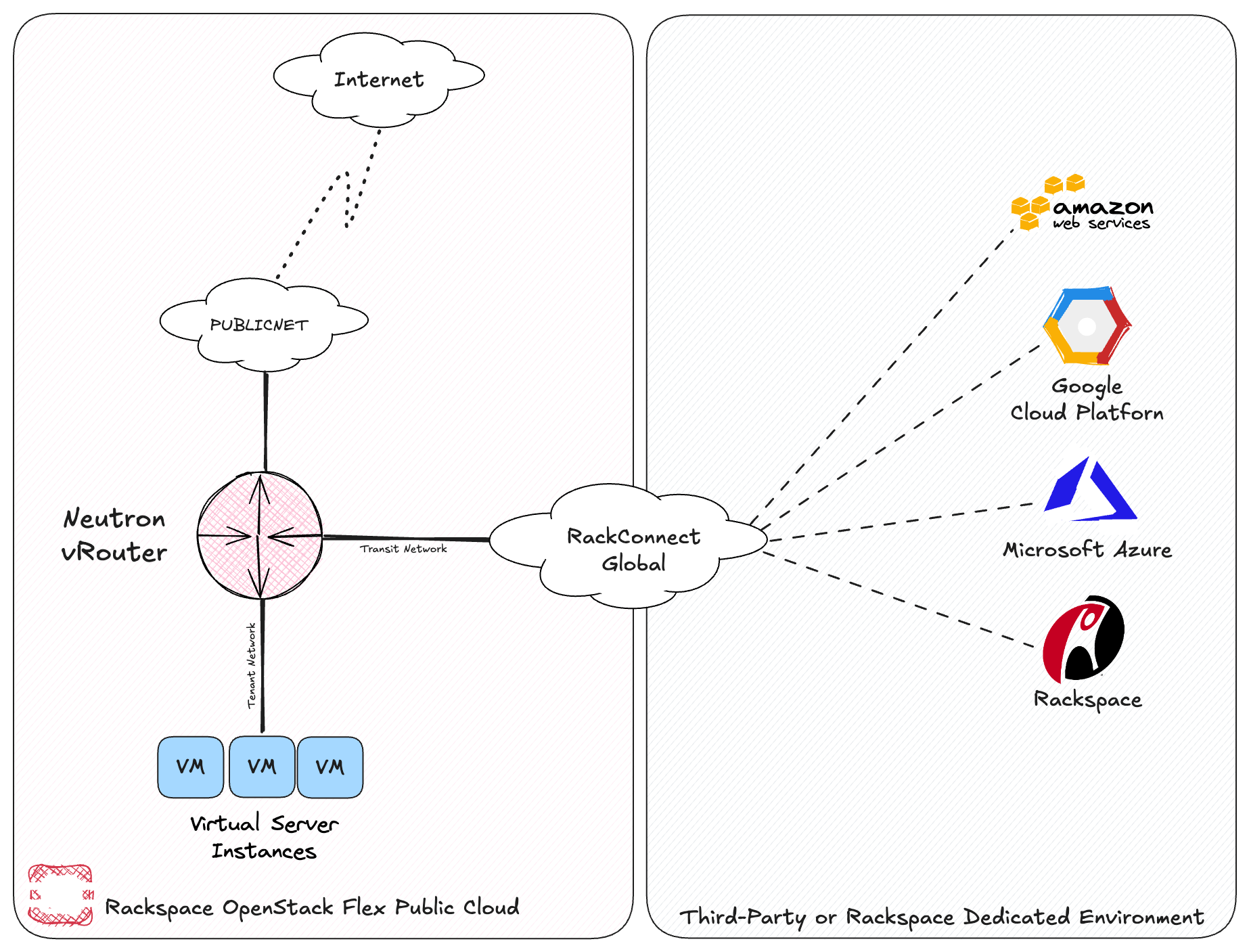 RackConnect Global allows customers to connect their OpenStack Flex resources to third-party environments, including popular hyperscalers, as well as existing dedicated footprints in a Rackspace datacenter.