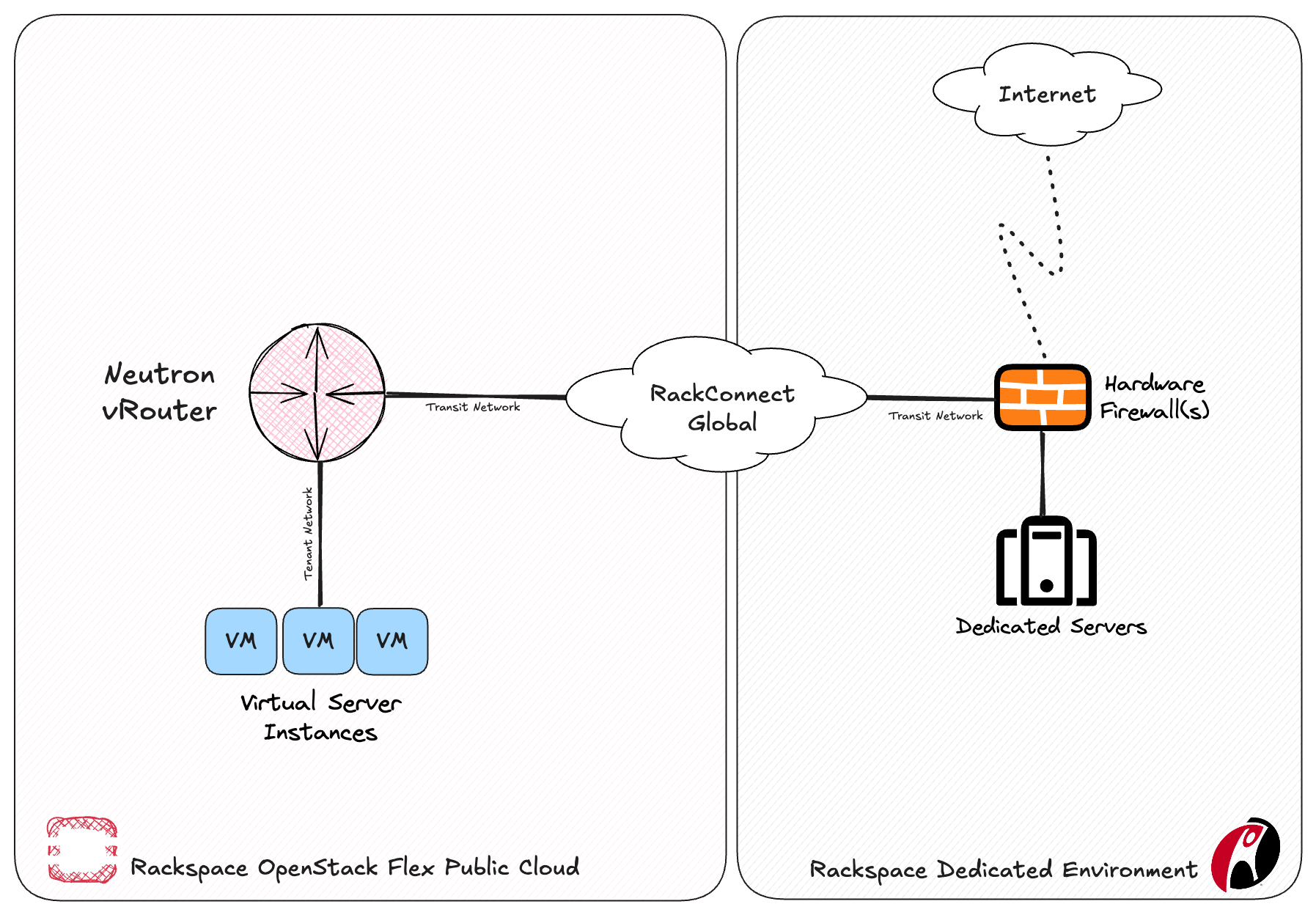 Customers with existing dedicated footprints in a Rackspace datacenter can deploy resources in an OpenStack Flex region and connect to those physical servers behind their dedicated firewall.